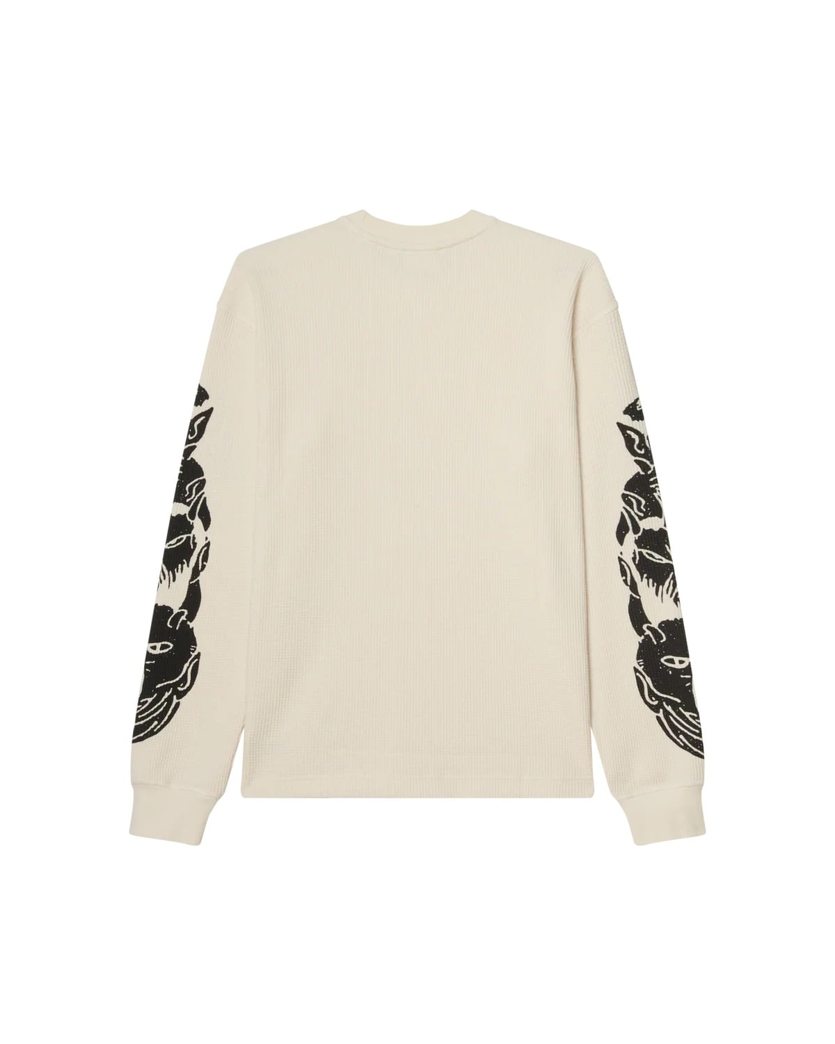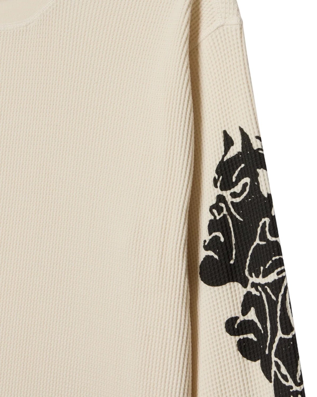 両袖にプリントが入ったサーマルロングスリーヴTシャツ。