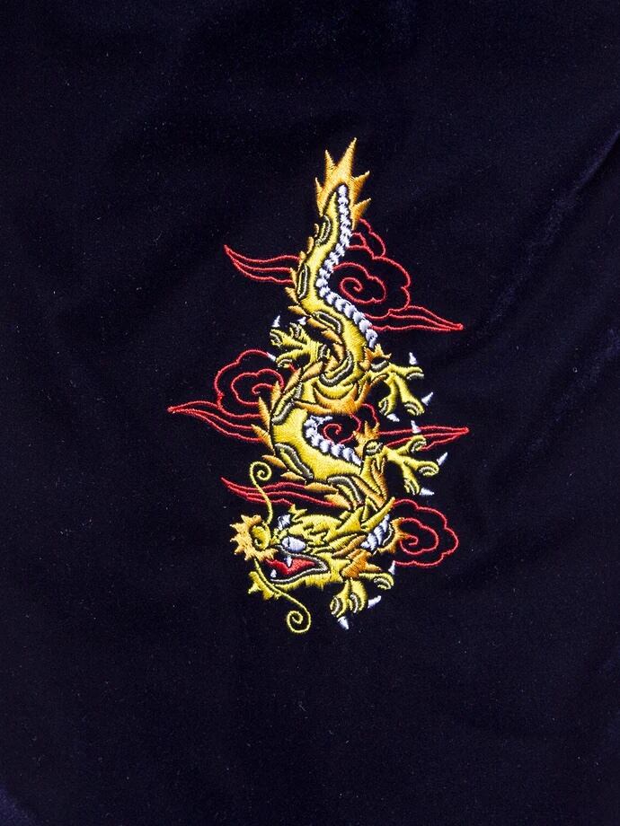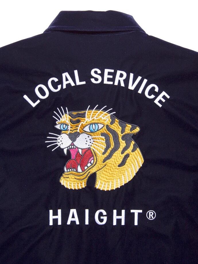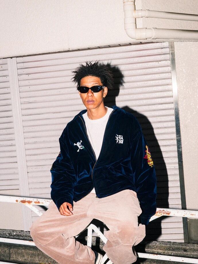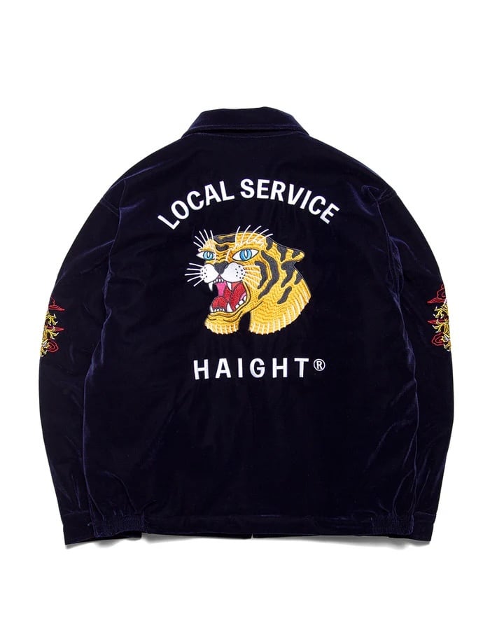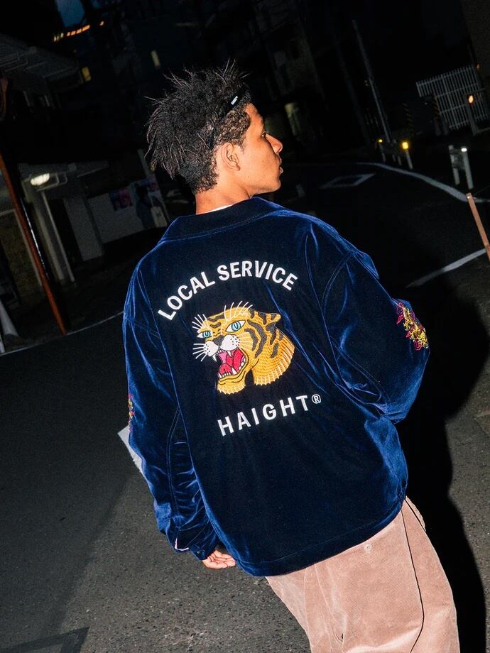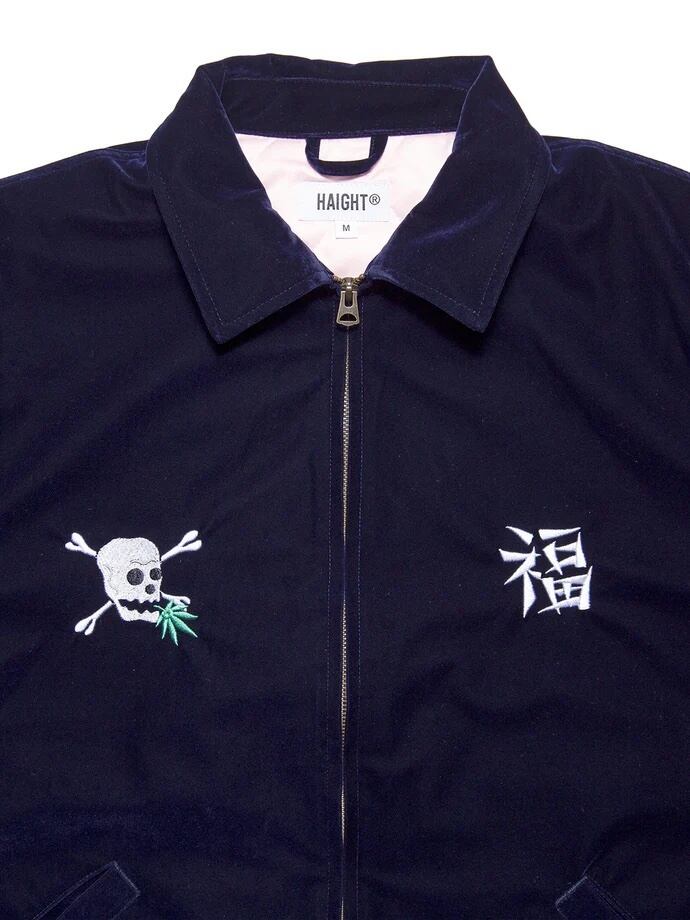 インパクトある背面の虎のアートワークをはじめ、両袖の龍、前身頃のドクロや福の一文字など、細部にわたって施された緻密な刺繍デザインは、仙台のTattoo Studio "SCRIBE TATTOO" による描き下ろし。艶感のあるベロアと、淡いピンク色のキルティング裏地の組み合わせがクラシックかつ華やかな印象。トラッドなデザイン性と防寒性を兼ね備えた一着。