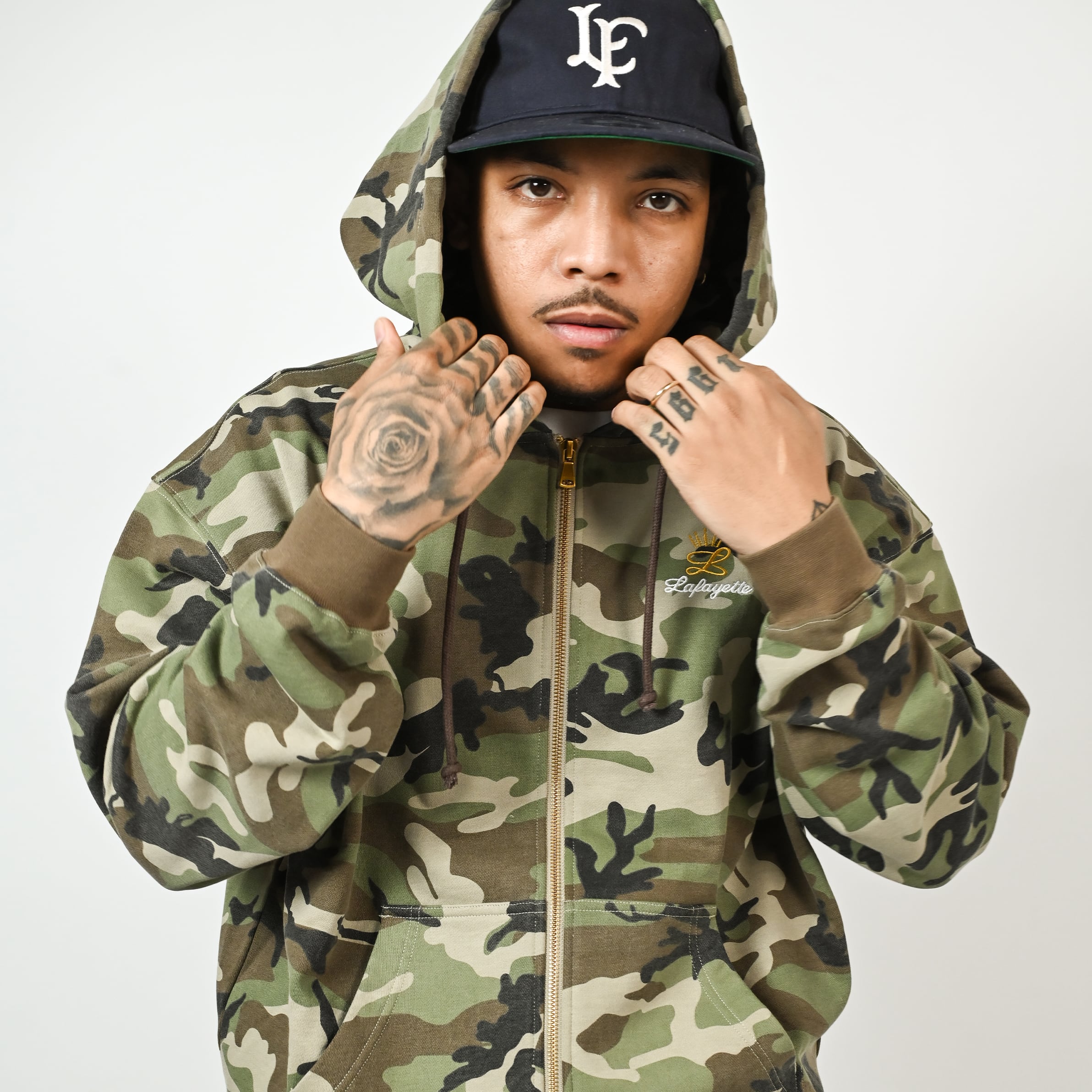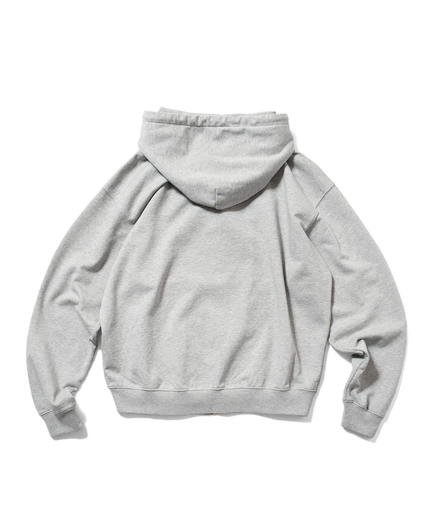 スクリプトとクラウンモチーフのグラフィックロゴを刺繍で落とし込んだジップパーカー。